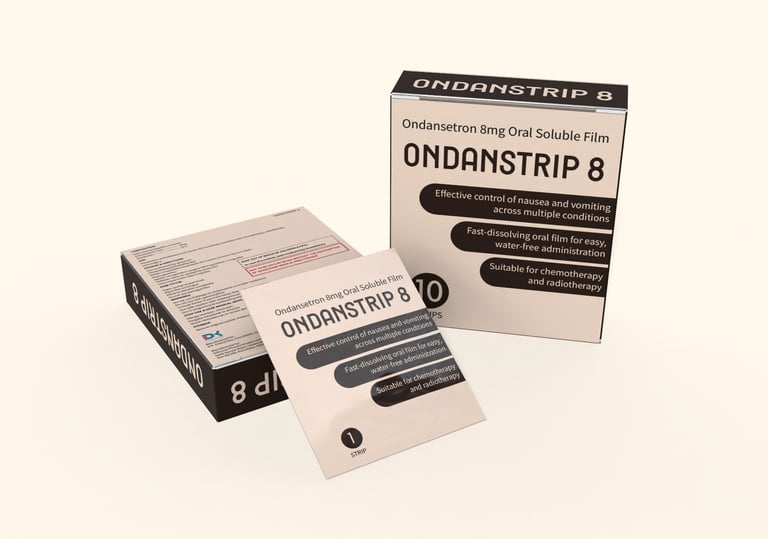 Ondansetron 8 mg oral soluble film is a higher-strength antiemetic designed for effective control of moderate to severe nausea and vomiting. The oral film dissolves quickly in the mouth, offering rapid onset of action without the need for water. It is particularly suitable for patients undergoing chemotherapy or experiencing severe post-operative symptoms.